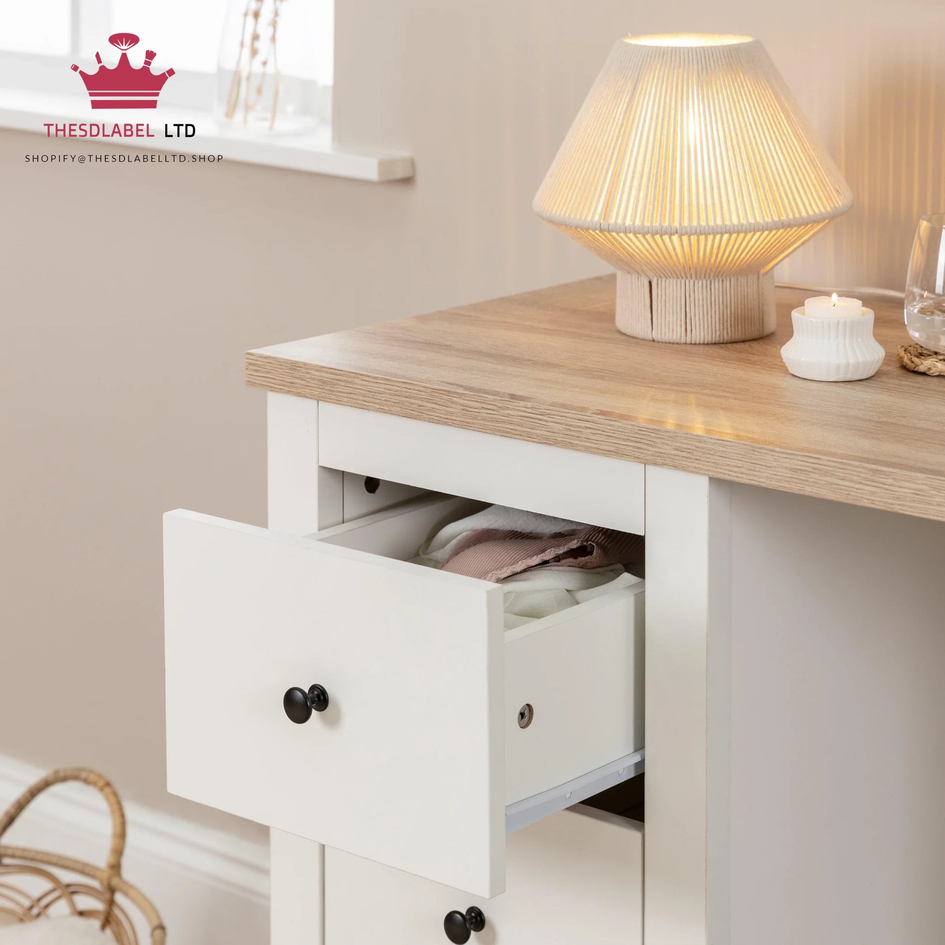 The Bampton dressing table is the ideal addition to any chic bedroom. In an on-trend alabaster white, this dressing table with drawers features an oak effect tabletop and matte black handles for a stylish ensemble.