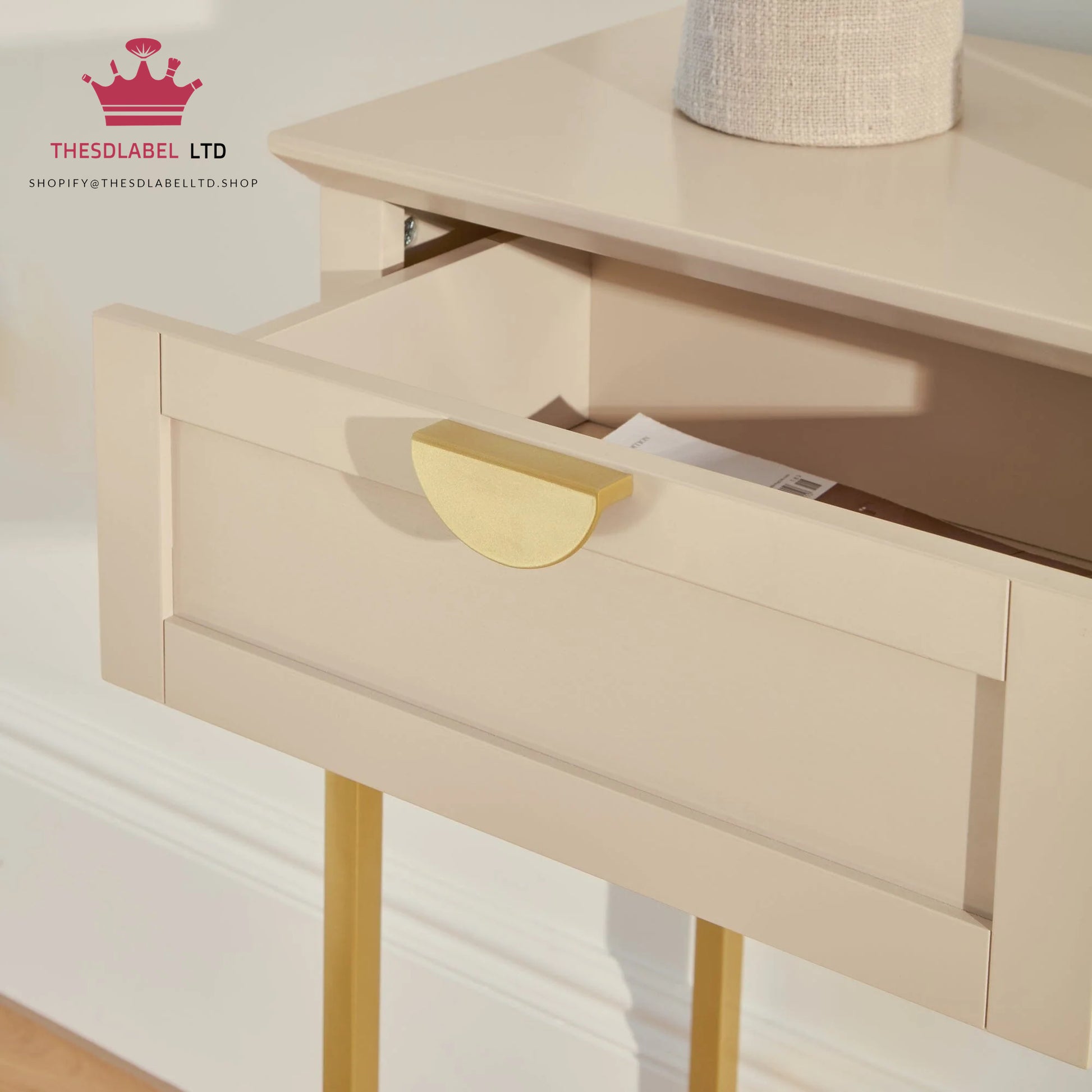 - Design features - 2 drawer console table with a subtly rounded top edge and shaker style drawer fronts with large half-moon shape handles and gold base frame.
