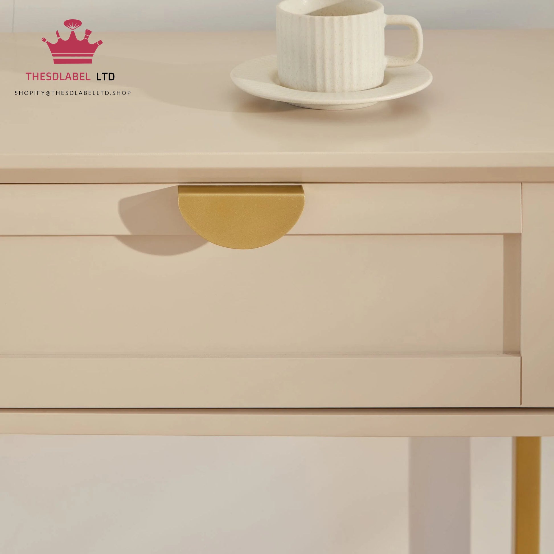 The Innes dressing table is the perfect way to complete your bedroom. This beautifully designed dressing table comes in a neutral taupe hue and features shaker style drawers for storage with chic half moon handles and gold legs.